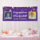 Honor and celebrate the graduate and welcome party guests with this purple, white and gold star themed banner sign with hand lettered brush script featuring two photos of the graduate. Personalize it with their name and class year. PHOTO TIP: For fastest/best results, choose a photo with the subject in the middle and/or pre-crop it to a square shape BEFORE uploading. CHANGES: Select a different background color or choose a styled graphic background or personalize by adding a text overlay by clicking CUSTOMIZE FURTHER. Contact the designer via Zazzle Chat or makeitaboutyoustore@gmail.com if you'd like this design modified or on another product.