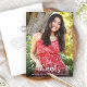 Make sure your favorite grad shows appreciation to all who supported their milestone event! Send out this stunning, simple, modern, personalized photo flat thank you card. A fun, playful visual of white script handwriting and cute, playful hearts, along with her name, class year, and school, overlay the photo of your choice. On the front, personalize the custom text with your grad’s name and class year. Add a personalized note on the back in soft gray typography, under the gray cap icon. Matching announcements, party invites, cap toppers, plaques and other graduation goodies are also available in this trendy and stylish collection. Guaranteed to add stylish fun to her special occasion!
