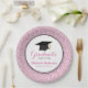 This graduation paper plate offers a girly design with a pink faux glitter border and accented with a graphic of a graduation hat. Custom text allows you to personalize with the graduate's name, graduating year and school.