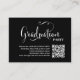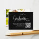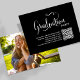 This design features a graduation QR code party invitation, with a modern calligraphy minimalist template, with photo template senior picture layout, with black and white typography, a simple invitation insert, details info information details, a grad party information info details, great for graduate high school or college, great for party invitation insert card, with a scan scannable QR code details, with a graduation hat cap mortarboard