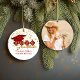 This keepsake ornament features red and gold cap and tassel on diamond shields with your graduating year, name and school on gold confetti background. Back features your favorite photo. Makes a great gift this holiday season. Easy to personalize with custom options.