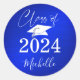 Modern faux brushed metallic royal blue graduation stationery envelope seals or favor stickers with a chic calligraphy script CLASS OF and editable year with a white graduation cap and your graduate's name (in your choice of font styles (shown in handwritten script). Add to graduation invitations, announcements and thank-you cards or use for graduation party thank-you favor stickers. ASSISTANCE: For help with design modification/personalization, color change, transferring the design to another product or if you would like coordinating items, contact the designer BEFORE ORDERING via the Zazzle Chat MESSAGE tab or email at makeitaboutyoustore@gmail.com.