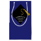 Graduation gift bag featuring creative black and gold cap design and congratulations line on a blue background. To customize, edit text to add name of your favorite senior class grad.