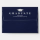 This design features graduation graduate grad party, a modern mortar board cap hat, a basic 5x7 a7 envelope size, a navy blue simple minimalist minimal, a traditional mortarboard mortar board, with a return address back flap printed, a plain clean simplistic minimalist, a graduation party invitation envelope, a graduation announcement envelope, a navy blue grad party envelope