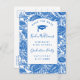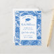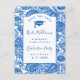 Invite family and friends to your high school graduation party with this simple custom "Save The Date" invitation postcard featuring modern and script typography accented with a blue grad cap icon and a toile pattern of blue sunflowers on white in the border. Add all your relevant information including the high school graduate's name, high school name, date and year on the cover and return address, day, date, year, time, venue address and RSVP details as well as space for writing your guest's address for delivery on the back. Designed by © Tim Coffey.