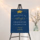 Welcome guests to your graduate's graduation party with this elegant, personalized foam board sign featuring gold star confetti, a gold faux glitter graduation cap and elegant handwritten script typography against an editable blue background color you can change to a school color or coordinating party theme color. OPTIONS: The sample is shown in a 18x24" size; other sizes are available (choose Custom Size for even borders by changing the height and width proportionately AFTER clicking the UNLOCK icon that looks like a chain link). You can also transfer the design to a poster, banner, tapestry backdrop or other products or have the designer convert it to a digital DOWNLOAD file for printing locally. ASSISTANCE: For help with design modification or personalization, color change, resizing, transferring the design or converting to a Download file, contact the designer BEFORE ORDERING via the Zazzle Chat MESSAGE tab or email makeitaboutyoustore@gmail.com.