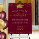 Welcome guests to your graduate's graduation party with this elegant personalized foam board sign featuring gold star glitter, a gold glitter graduation cap or mortarboard and elegant handwritten script typography against an editable maroon or burgundy background color you can change to a school color or coordinating party theme color. ASSISTANCE: For help with design modification or personalization, color change, resizing, transferring the design to another product or you would like coordinating items, contact the designer BEFORE ORDERING via the Zazzle Chat MESSAGE tab or email makeitaboutyoustore@gmail.com.