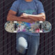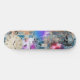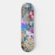 Unique abstract design skateboard has a rustic blue brick wall background, a clock, skull, graffiti and watercolor galaxy overlays on it. Your friends will be so envious of your new skateboard!