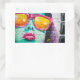 A cool painting on a brick wall of a girl in hot pink and yellow sunglasses with hot pink lipstick. She is done in light turquoise and mint green.