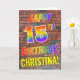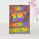 The front of this eye-catching, fun and exciting birthday-themed greeting card design features the message "HAPPY 15TH BIRTHDAY" with letters having a multicolored rainbow like gradient pattern, and a personalized name colored yellow, on a wall-of-bricks pattern background. The appearance is inspired by that of graffiti or street art drawn on a wall. The inside features a birthday greeting message that can be customized. A happy, fun, customizable birthday greeting card like this might be used to send a birthday greeting message to somebody who is celebrating their 15th birthday. [~Z0000357]