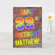 The front of this eye-catching, vibrant and exciting birthday-themed greeting card design features the message "HAPPY 32ND BIRTHDAY" with letters having a multicolored rainbow like gradient pattern, and a editable name colored yellow, on a brick wall pattern background. The appearance is inspired by that of graffiti or street art drawn on wall. The inside features a personalized birthday greeting message. A fun, happy, personalized birthday greeting card like this might be a special way to send a birthday greeting to somebody who is celebrating their thirty second birthday. [~Z0000357]