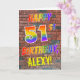 The front of this eye-catching, vibrant and fun birthday-themed greeting card design features the message "HAPPY 51ST BIRTHDAY" with letters having a multicolored rainbow like gradient pattern, and a editable name colored yellow, on a brick wall pattern background. The style is inspired by that of graffiti or street art drawn on wall. The inside features a personalized birthday greeting message. A happy, fun, editable birthday greeting card like this might be given to somebody celebrating their 51st birthday. [~Z0000357]