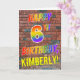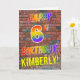 The front of this eye-catching, vibrant and exciting birthday-themed greeting card design features the message "HAPPY 6TH BIRTHDAY" with letters having a multicolored rainbow like gradient pattern, and a custom name colored yellow, on a wall-of-bricks pattern background. The look is inspired by that of graffiti or street art drawn on a wall. The inside features a birthday greeting message that can be personalized. A fun, happy, editable birthday greeting card like this might be used to send a birthday greeting message to somebody celebrating their sixth birthday. [~Z0000357]