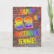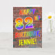 The front of this eye-catching, fun and exciting birthday-themed greeting card design features the message "HAPPY 82ND BIRTHDAY" with letters having a multicolored rainbow like gradient pattern, and a personalized name colored yellow, on a brick wall pattern background. The style is inspired by that of graffiti or street art drawn on wall. The inside features a personalized birthday greeting message. A fun, happy, customized birthday greeting card like this might be given to celebrate somebody’s eighty second birthday. [~Z0000357]