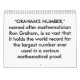 "GRAHAM'S NUMBER," named after mathematician Ron Graham, is so vast that it holds the world record for the largest number ever used in a serious mathematical proof. Graham's number is much larger than other large numbers such as a googol and a googolplex. In fact, the observable universe is far too small to contain a written representation of Graham's number.