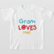 Gram Loves Me T-shirts, cards, stickers, bodysuits bags, and more with colorful red, yellow, and blue text and heart design. These Gram Loves me apparel and gift items will make gram smile!