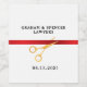 Modern and elegant grand opening wine label set featuring a gold pair of scissors cutting a red ribbon perfect for for company events, housewarming parties, product reveals, new businesses and similar occasions.