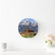 This clock features a scenic view photo of an old barn and fence with the snow-capped Rocky Mountains Grand Tetons area in the background.