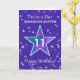 Celebrate your growing granddaughter on her 11th birthday with a card as bright and lively as she is! A big, dazzling star in rich watercolor shades of blue, purple, green, and pink is framed by a soft periwinkle sky and dancing textured stars. A sweet and upbeat design to let her know how much she sparkles in your world.
