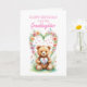 Send birthday wishes to your granddaughter on her third birthday in the cutest way possible with this lovely card. A teddy bear, in front of a bunch of colorful flowers, presents a heart showcasing the age of 3. Make their birthday unforgettable with this charming card. A 3rd birthday card for a granddaughter.