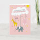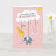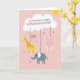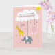 This card features a soft pastel pink background with a white, cloud-shaped banner at the top carrying the text “ON THE ARRIVAL OF YOUR GRANDDAUGHTER” in a neat, rounded dark gray style. Hanging beneath like a nursery mobile, the elements feel gently arranged as if they’re drifting close together in a sweet, welcoming scene. On the left stands a sunny yellow giraffe with orange spots, angled slightly inward as though leaning in with friendly curiosity. On the right, a small pink baby romper with faint diagonal stripes hangs neatly, adding a cozy, caring touch to the layout. Near the center, a light gray elephant with a curved trunk faces the other items, creating a calm, companionable balance, while a small rainbow arches above it like a quiet promise 🌷. In the upper right, a warm yellow sun with simple rays glows over scattered stars in yellow, purple, white, and pink, sprinkled across the background like confetti 🐰. The banner sits centered at the top, with the mobile-like figures spaced evenly below, and the stars dotted around the giraffe, elephant, rainbow, and romper.
