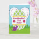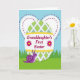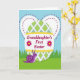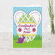 This card features a large decorative egg centered on the front, filled with lime-green diamond shapes over a white base and wrapped with a sunny golden-yellow band. At the top of the egg sits a simple double-lobed outline that reads like bunny ears 🐰, traced in magenta with dotted and dashed accents for a light, friendly touch. Across the middle of the egg, the text “Granddaughter’s First Easter” is written in flowing magenta lettering, giving the design a gentle, affectionate tone. Small fuchsia flowers with bright yellow centers sit near the wording, like little blooms placed close as if in a caring gesture 🌷. Near the bottom of the egg, a plum-colored snail rests with a deep violet spiral shell and slim antennae, adding a soft, companionable character to the scene. The background is split into two horizontal sections, with a sky-blue upper area above a warm green ground. Thin, stylized grass blades rise from the green band, framing the lower edge beneath the egg.