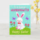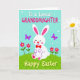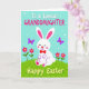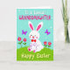This card shows a plump white rabbit with pink inner ears and matching paw pads sitting on a green, polka-dotted grassy mound, wearing a neat red bow tie and a soft blush on its cheeks as it smiles with eyes closed 🐰. The rabbit’s relaxed pose and rosy cheeks give it a sweet, affectionate look, like it’s quietly enjoying a friendly moment with the viewer. Behind it, the sky is a pale blue filled with small white dots that keep the scene light and airy. On both sides, simple pink four-petal flowers with yellow centers rise on thin green stems, arranged in a balanced way that frames the rabbit like a gentle bouquet 🌷. Two purple butterflies with small red bodies float above, angled as if they’re drifting toward each other. At the top, the message “To a Special Granddaughter” is set in large white letters with magenta accents, centered across the sky. Near the bottom, “Happy Easter” appears in bright yellow lettering placed just above the grass. The flowers sit low at the left and right edges, while the butterflies hover in the upper middle against the dotted blue background.