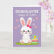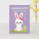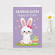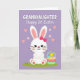 This card shows a stylized white bunny with long upright ears, sitting quietly on a bright green patch of grass with a gentle smile and wide dark eyes 🐰. A pink bow on its head adds a sweet, affectionate touch, like it’s dressed up for someone special. Beside the bunny sits a small basket in mixed colors, filled with pastel egg shapes that suggest a spring holiday moment. The background is a soft lavender field sprinkled with floating pink hearts, giving the scene a tender, friendly mood 🌷. Across the top, large white text is arranged in two lines, with “GRANDDAUGHTER” prominent and “Happy 1st Easter” placed just below it. The lettering stands out clearly against the lavender, while the hearts drift around it without covering the words. Pink hearts rise throughout the lavender background behind the bunny and basket.