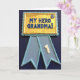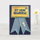 This card features a raised award-style emblem centered on a deep navy blue background, with glossy gold and cool blues that feel like a warm thank-you wrapped in a hug ❤️. Near the top sits a shiny gold rectangular plaque bordered by a wavy sky-blue frame, like a soft ribbon edging. Across the plaque, chunky navy blue letters read “MY HERO GRANDMA!” and the text sits squarely in the middle for a proud, spotlighted look. In the upper right corner of the plaque, a small round badge in white and dark blue shows a simple paw-like symbol, adding a gentle, caring touch 🌼. Below the plaque, two light-blue streamers drop down in a neat V shape, outlined in sky blue as if carefully trimmed. The right streamer carries a raised white “1,” suggesting she’s someone you’d choose first, with the kind of close bond that shows in small details rather than big speeches. The mix of reflective gold against matte blues gives the emblem a trophy-like shine while still feeling soft and affectionate. The final look is a centered gold plaque with navy lettering, a tiny round paw badge at the top right, and two blue ribbons ending in a white “1” on the right tail.