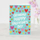 This Valentine's Day card features a bright turquoise background with the message “GRANDMA HAPPY VALENTINE’S DAY” in large white sans‑serif letters centered on the front. The words take up most of the middle of the card, so the greeting is the first thing you notice. All around the text, heart shapes are scattered across the whole design like confetti. The hearts come in deep red, orange, yellow, pink, and a touch of olive green, with a mix of solid fills plus stripes, polka dots, and tiny speckled patterns. The overall look feels sunny and affectionate, like a big hug from across the room. It’s a sweet choice for a grandma because it’s simple, direct, and full of love without needing a lot of extra words 🥰. It’s also easy to give from a grandkid, adult child, or anyone who wants to show steady care and appreciation ❤️. Hope it helps you share Valentine’s Day sentiments with someone you love.