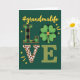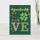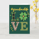 This design shows a deep forest-green background with “#grandmalife” centered near the top in golden-yellow lettering, setting up a cozy, affectionate mood 💚. Below it, the word “LOVE” sits large in the middle, and the letters lean into each other like close friends posing for a photo. The “L” is filled with green-and-black buffalo plaid and edged with a golden-orange glittery outline that gives it a warm glow. The “O” is a four-leaf clover in emerald and lime tones, with a sparkling orange center that feels like a lucky little wink ☘️. The “V” carries a leopard pattern in oranges and browns, also traced with the same golden-orange glitter edge for a tied-together look. The “E” is fully lime-green glitter, brightening the right side of the word like a cheerful finish. Small golden stars and sharp yellow burst lines are scattered around the letters across the green field.