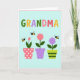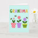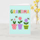 This card features a pale aqua background framed by a thin, soft pink border, setting a gentle, affectionate tone ❤️. Across the top, the word “GRANDMA” appears in large, rounded letters, each one a different pastel shade like green, orange, lavender, pink, and yellow. The colorful title sits centered near the upper edge, leaving airy space below for the illustration to feel calm and open. Along the bottom half, three potted plants line up side by side like a small windowsill garden, giving the scene an easy, friendly closeness. On the left, a coral pot with tiny dots holds a softly curled pink tulip, leaning slightly as if nodding hello. In the middle, a solid lavender pot supports a full rose-pink bloom with layered petals, while the right pot shows lime-green stripes beneath a light purple, star-shaped flower 🌼. Three small round insects with black-and-yellow stripes and simple pale wings hover between the blossoms, spaced evenly above the pots.