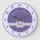 Grandmas Kitchen Wall Clock, Chex PURPLE-is a graphics art design of an allover chex pattern. The pattern is similar to the pattern you used to see on grandma's kitchen cook books. The outside of this clock is the purple/white chex pattern. The center of the clock is a solid purple color with white text. Cursive text at the top of the plate reads: Grandma's Kitchen. The text on the bottom reads: Enjoy Life it's Delicious! A ribbon with tag sits across the bottom for personalizing with an initial or name. The clock numbers are printed in purple. This clock is available in assorted colors and texts. For melamine plates that coordinate, see my zazzle.com/zazzleplates store.