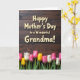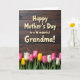 This card features a dark, richly grained wooden background that feels cozy and familiar, like a well-loved table where family gathers. Centered near the top is the message “Happy Mother’s Day to a Wonderful Grandma!” in creamy yellow lettering with a soft shadow that makes it look slightly raised. The warm tone of the text against the deep wood creates a gentle, affectionate contrast, as if the words are being spoken softly to someone dear ❤️. Along the bottom edge, a neat row of spring flowers forms a natural border, arranged with care like a small offering set out with loving attention. The blooms are tulip-shaped in soft white, sunny yellow, and tender pink, alternating in color so the line of flowers feels balanced and friendly. Some petals are still snug while others open outward, and the fresh green stems add a calm, garden-like touch 🌼. The flowers sit tightly together across the lower frame, with pale petals and glossy stems standing out against the dark wood.