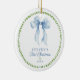 Grandmillennial baby’s first Christmas photo ornament features a delicate and timeless design that captures the joy of welcoming a new little one during the holiday season. The front includes soft blue script and serif fonts framed by a green laurel wreath and topped with a watercolor-style blue bow for a classic heirloom look. The back displays a full custom baby photo, bordered by matching botanical accents and elegant ribbon illustrations. Ideal as a keepsake for new parents or a thoughtful gift for grandparents, this ornament celebrates baby’s first Christmas with vintage charm and personalized warmth.