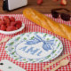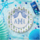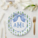 This topiary plate design features a very chic blue and green lattice patterned background with a coordinating blue and white striped bow. You can personalize with your monogram initials.