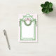This notepad has a preppy grandmillennial design featuring an green pagoda frame with a Christmas Wreath adorned with a pink gingham bow. The bottom has green text where you can personalize with a name.