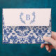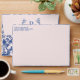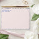 This envelope features a preppy grandmillennial design featuring a navy blue damask pattern on a blush pink background. There is a place on the front to add your name and address. The front has a blush pink background and the back flap has a monogram initial.