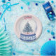 This Christmas plate has a Pink & Blue Damask Snow Globe with a Christmas tree with pink ornaments.