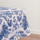 This tablecloth features grandmillennial design featuring a navy blue damask pattern on a blush pink background.