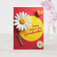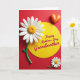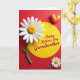 This card features a rich crimson background that immediately draws your eye to a large white daisy near the upper left, its petals gently ridged around a golden-yellow center. A glossy green stem drops downward, giving the flower a graceful, growing feel, like a quiet gesture of care ❤️. In the middle sits a sunny yellow circle that feels like a spotlight, adding warmth to the layout and balancing the red field around it. Inside that circle, the message “Happy Mothers Day Grandmother” is centered in flowing dark lettering with a light outline for contrast and readability. A small matching white-and-yellow flower rests in the lower right, echoing the main bloom like a sweet companion 🌼. Near the upper right, a plump orange heart with a shiny highlight adds a cozy, affectionate touch without needing any extra characters. Soft shadows around the flowers, heart, and center circle give the shapes a gently raised, almost sculpted look against the flat red background.