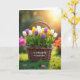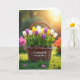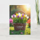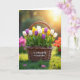 Designed with a gentle garden scene, the card centers on a warm brown woven basket resting on fresh green grass, as if set down during a quiet walk with someone you adore ❤️. Inside the basket, spring flowers stand tall in soft white, sunny yellow, and deep purple, with sturdy green stems and small leafy sprigs filling the gaps. Light pours in from the upper right in a golden wash, giving the blooms a tender glow that feels like an early morning shared side by side. The background fades into a dreamy blur of pink and red flowers, like a distant garden where close friends might linger and talk. Across the design, the message “To a Wonderful Grandmother” appears in a neat, dark-toned lettering that’s easy to read against the bright scene 🌼. The basket’s weave is sharply detailed, and tiny blades of grass around it catch little highlights as if still damp with dew. Behind the basket, the out-of-focus blooms form soft circles of light in rosy and crimson shades.