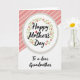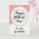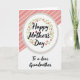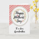 Designed with a centered white circular badge that draws the eye right away, this card keeps the layout simple and sweet ❤️. A light, textured ring frames the circle, giving it a soft, fabric-like touch without feeling busy. Inside the circle, “Happy Mother’s Day” sits in dark, flowing lettering, standing out clearly against the bright background. A leafy green wreath with small five-petaled pink flowers and pale yellow centers wraps around the words, like a gentle hug from the design itself 🌼. A small red heart takes the place of the dot above the “i” in “Mother’s,” adding a tender romantic note in a tiny detail. Beneath the circle, “To a dear Grandmother” appears in the same dark, flowing style, aligned neatly below the main greeting. The background is split diagonally, with soft pastel pink stripes in the upper area and plain white in the lower section.