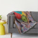 A quality printed throw has its advantages. This is a much finer weave throw than its loopier cousins, and though lighter, it is worth the investment for custom room accessorizing. The back is much prettier than the typical brown, and the fringe on the long sides very vivid, the selvage nicely done. Before photographing, I washed the throw in cold water, delicate, with a thicker woven throw the same size. On tumble dry low, this throw was dry in half the time as the other. This is a very practical quality if you use throws for furniture covers or to wrap up in frequently. The sleekness of the fabric makes it a great layer for accenting or protecting without the feeling of sitting on too much stuff. Perfect for napping or when you feel a light chill coming on. The color printing is beautiful and on this fabric, matched the design and color of my Photoshop image. This is an advantage for blending room fabrics and colors. The fringe on the short sides prints the colors from the design image and therefore varies from the side fringe. I streaked a white fractal line through the plaid pattern to give the illusion of weaving. This printed as crisp as an illusory thread, and put some white in the short side fringe, showing another advantage of print vs loomed- for artistic purposes, line lines, detail, and color integrity can be planned and preserved. My loomed throws have color limitations and more of a needlepoint texture. Print throws reproduce an exact image. The throw felt a little stiff straight out of the package, but this went away in the first delicate wash. Of course I searched the wash water for ink or bleeding and there was none.