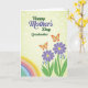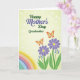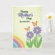 This greeting card features a celebratory message centered near the top, with “Happy Mother’s Day” written in flowing purple lettering above the word “Grandmother” in a tidy dark green style. The lettering feels affectionate and close, like a gentle note meant for someone cherished ❤️. In the lower right, two large flowers with soft purple petals and sunny yellow centers sit beside smaller blue blooms, arranged as if freshly gathered. Just above the flowers, two butterflies with patterned orange wings hover mid-flight, adding a light, friendly energy to the scene 🌼. A soft rainbow arc curves up from the lower left corner, showing pastel bands of yellow, orange, pink, lavender, and mint green. The background is a pale yellow-green wash, dotted with small white glowing circles that look like floating light. The flowers and butterflies are outlined with a slightly textured look, and the rainbow sits low and left while the white circles scatter across the open space behind them.