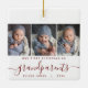 Help them commemorate their grandchild's first Christmas with this beautiful modern keepsake ornament. The gray text reads "Our first Christmas as grandparents," with the word "grandparents" in elegant burgundy red handwriting script with flourishes before and after. Replace the three sample images with your favorite vertical photos, and add baby's name and the year.