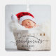 Help them celebrate their first grandchild with this beautiful modern keepsake ornament. The off-black text reads "Our first Christmas as grandparents," with the word "grandparents" in elegant handwriting script with flourishes before and after. Easily replace the sample image with your favorite photo of the new baby, and add his or her name and the year. A white gradient filter helps make the text pop.
