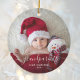 Help them celebrate their first grandchild with this beautiful modern keepsake ornament. The white text reads "Our first Christmas as grandparents," with the word "grandparents" in elegant handwriting script with flourishes before and after. Easily replace the sample image with your favorite photo of the new baby, and add his or her name and the year. A dark gradient filter helps make the text pop.
