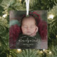 Help them celebrate their first grandchild with this beautiful modern keepsake ornament. The white text reads "Our first Christmas as grandparents," with the word "grandparents" in elegant handwriting script with flourishes before and after. Easily replace the sample image with your favorite photo of the new baby, and add his or her name and the year.