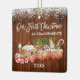 Modern Brush Script Our First Christmas as Grandparents Ornament includes Watercolor Gingerbread Train with candy, cookies and pines. Rustic Country Wood Print with Snow.